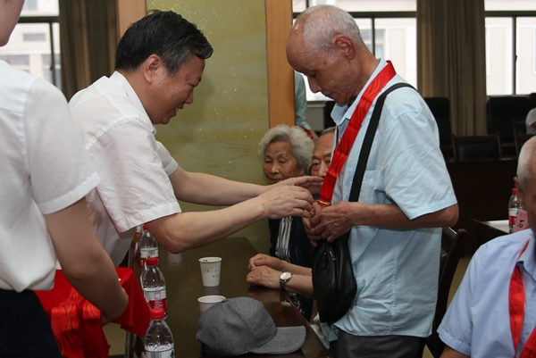 祖明在仪式上宣读了安徽工业大学“光荣在党50年”纪念章获颁人员名单,我校共有87名老党员获此殊荣。刘新跃、魏先文、祖明向“光荣在党50年”的老党员颁授并佩戴纪念章。
